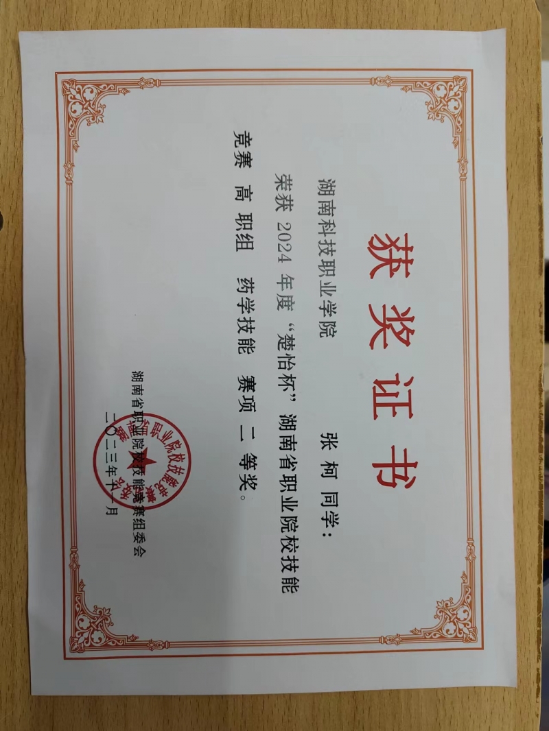 2024年度“楚怡杯”湖南省职业院校技能竞赛药学技能竞赛于2023年12月16-17日在长沙卫生职业学院举行。该赛项由湖南省教育厅主办,长沙卫生职业学院承办,三诺生物传感股份有限公司、河南白方千草实业有限公司、湖南科技贸易有限公司协办。省内有10所开办药学类专业的职业院校参赛,20名参赛学生经过两天激烈的技能比拼,我院戴玲、张思两位老师指导药品经营与管理3211班张柯同学位列第三名,荣获省赛二等奖。