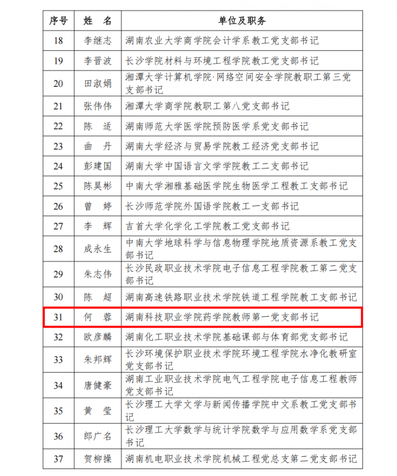 近日,中共湖南省委教育工委公布了全省高校党建工作系列评选结果,我校药学院教师第一党支部书记何蓉同志荣获“全省高校党建工作‘双带头人标兵’”称号。