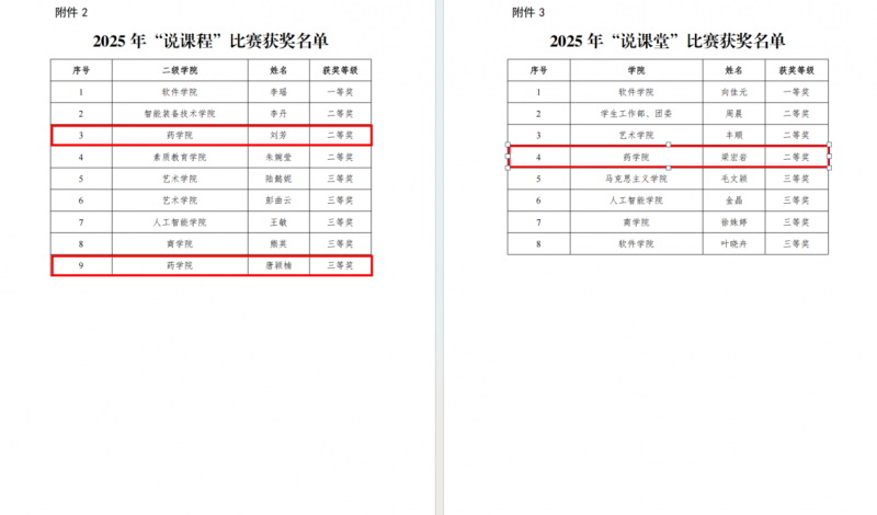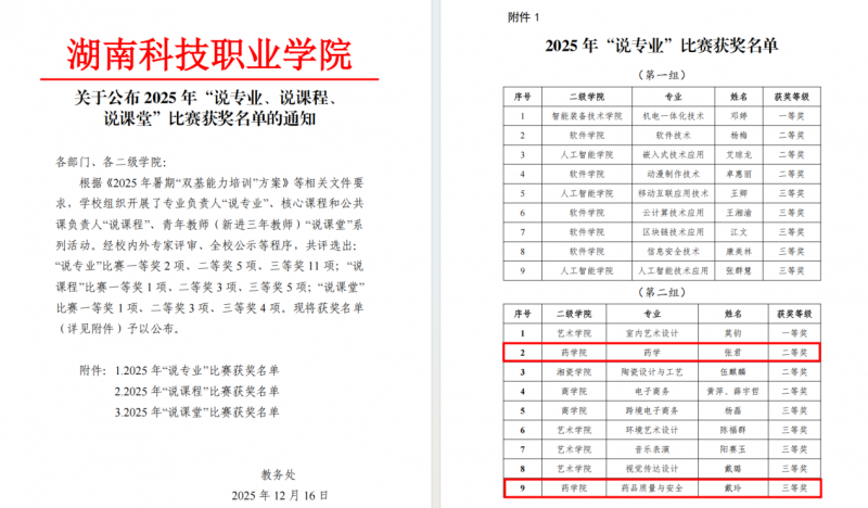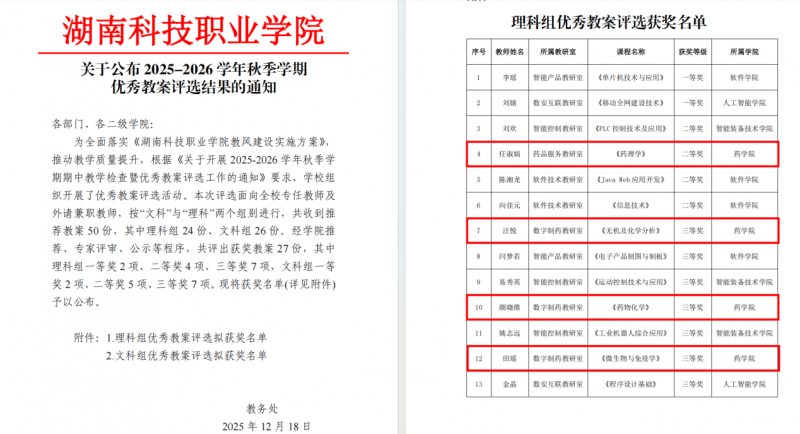 近期,学校陆续公布2025年“说专业、说课程、说课堂”比赛、2025—2026学年秋季学期优秀教案评选及2025年教师职业能力竞赛教学能力比赛结果,药学院教师表现突出,在各项评比中屡获殊荣,充分展现了我院教师扎实的教学功底与持续的教研活力。